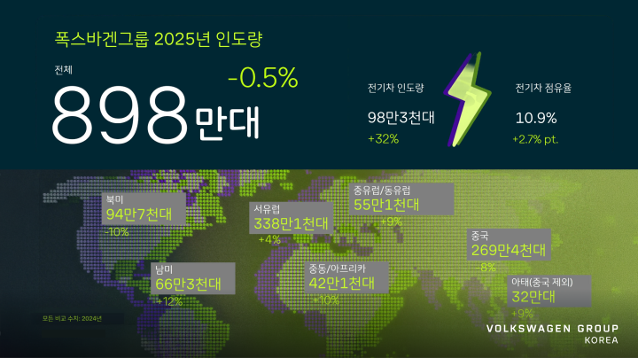 (2026년 1월 21일) 폭스바겐이 2025년 한 해 동안 전 세계 시장에서 473만 대의 차량을 인도하며 도전적인 시장 여건 속에서도 전년 대비 1.4% 감소에 그친 견고한 실적을 기록했다.폭스바겐은 유럽(+5.1%)과 남미(+18.5%) 시장에서 뚜렷한 성장세를 보였으며, 특히 유럽 시장에서 순수 전기차 ID. 패밀리 모델과 내연기관 모델 모두 지속적