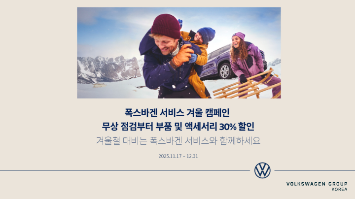 (2025년 11월 17일) 폭스바겐코리아가 11월 17일(월)부터 12월 31일(수)까지 ‘2025 폭스바겐 서비스 겨울 캠페인’을 실시한다. ‘2025 폭스바겐 서비스 겨울 캠페인’은 고객들의 안전한 차량 운행을 위해 관리가 필요한 주요 부문의 무상 진단 서비스와 함께 부품, 액세서리 할인 등 다양한 혜택을 제공한다. 캠페인