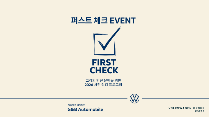 (2026년 3월 16일) 폭스바겐코리아의 공식 딜러사 지엔비오토모빌이 고객의 안전한 운행을 위한 사전 점검 프로그램인 ‘퍼스트 체크(First Check)’ 이벤트를 실시한다. 2026년을 맞아 고객의 안전을 최우선 가치로 두고 기획된 퍼스트 체크 이벤트는 ‘먼저 받는 서비스’라는 콘셉트 아래 고객이 요청하기 전에 반드시 확