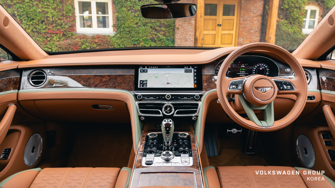 대시보드는 두 가지 월넛 베니어의 이중 마감으로 구성되며, 사이프러스 그린 컬러의 핀스트라이프로 구분된다. 핀스트라이프는 송풍구와 도어 상단에도 연결되며, 뒷문 내부의 패널 역시 버 월넛 베니어로 마감돼 우아함을 더했다.