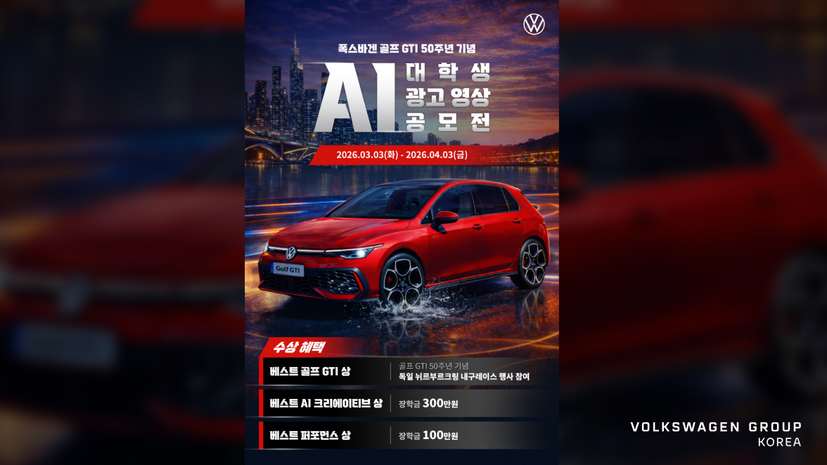 (2026년 3월 3일) 폭스바겐코리아가 올해 골프 GTI 탄생 50주년을 맞아 대학생을 대상으로 한 ‘골프 GTI 대학생 AI 영상 광고 공모전’을 개최한다.