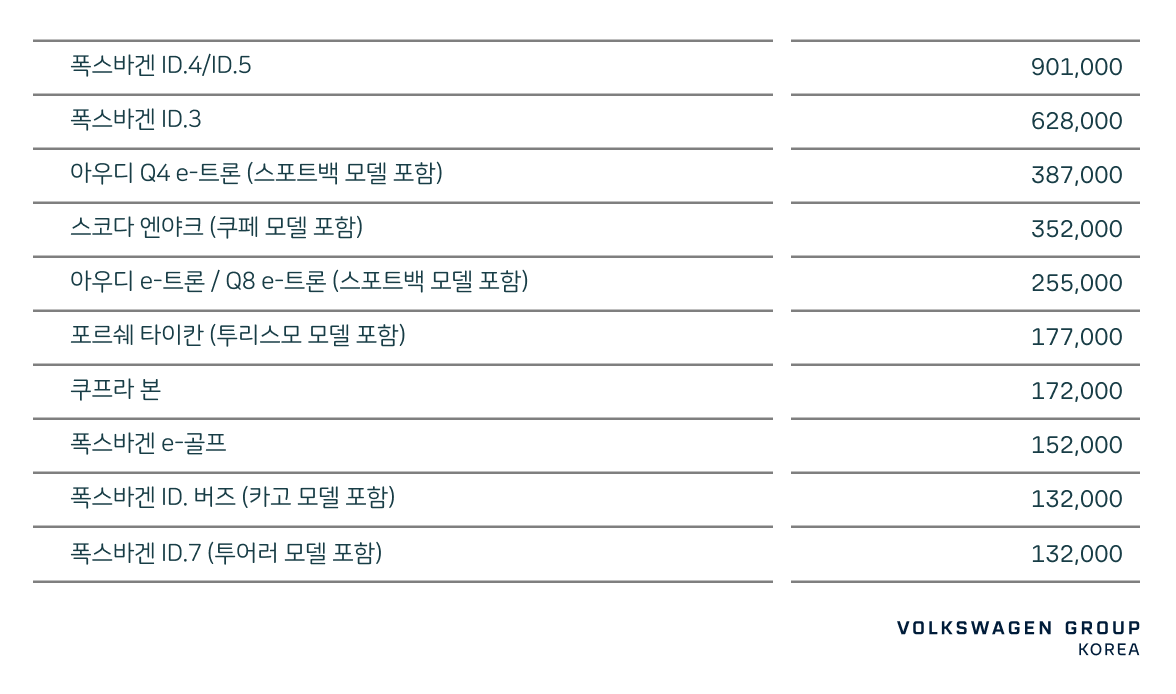 하기 목록은 폭스바겐그룹의 가장 인기 있는 상위 10개 BEV 모델로, 이들은 전체 인도량의 80% 이상을 차지하고 있다 (단위: 대).