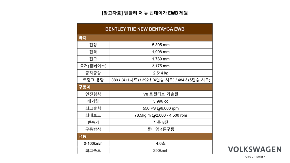 (2023년 12월 12일) 벤틀리모터스코리아는 서울 동대문구 벤틀리 타워에서 플래그십 럭셔리 SUV ‘더 뉴 벤테이가 EWB’를 국내 최초로 공개하고, 한국 시장에 공식 출시한다.