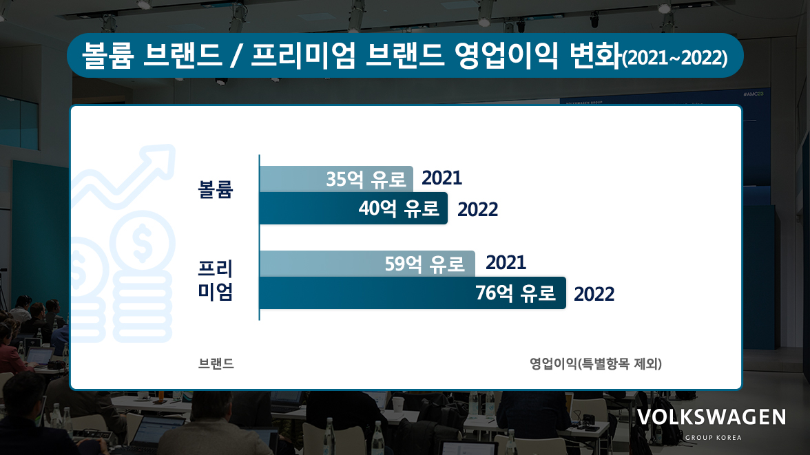 2022년, 폭스바겐그룹은 2021년 대비 12.5% 증가한 225억 유로의 영업이익(특별항목 제외)을 기록하였으며 자동차 부문 순유동성 측면에서도 전년 대비 증가한 430억 유로를 기록하였습니다. 지속적인 비용 개선 및 가격 정책 반영, 각 브랜드에서의 제품 다변화를 통해 성장을 이끌어낼 수 있었습니다.