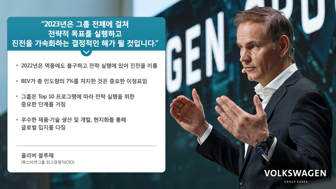 “2022년은 그룹 비즈니스 모델의 견고함을 인상적으로 보여주었던 해였습니다. 어려운 상황에서도 총 572,100대의 BEV를 인도하였으며, 전반적인 수익 및 영업이익 또한 증가하였습니다. 2023년은 여러 경제 상황을 고려할 때 결코 만만하지 않겠지만, 경쟁력 있는 제품과 180만 대에 이르는 주문량에 근거한 강력한 브랜드는 그룹에 자신감을 선사합니다. 견고한 수익 창출을 목표로 강력한 재정 기반을 활용하여, 전동화와 디지털화에 대한 그룹의 투자를 지속하겠습니다.”