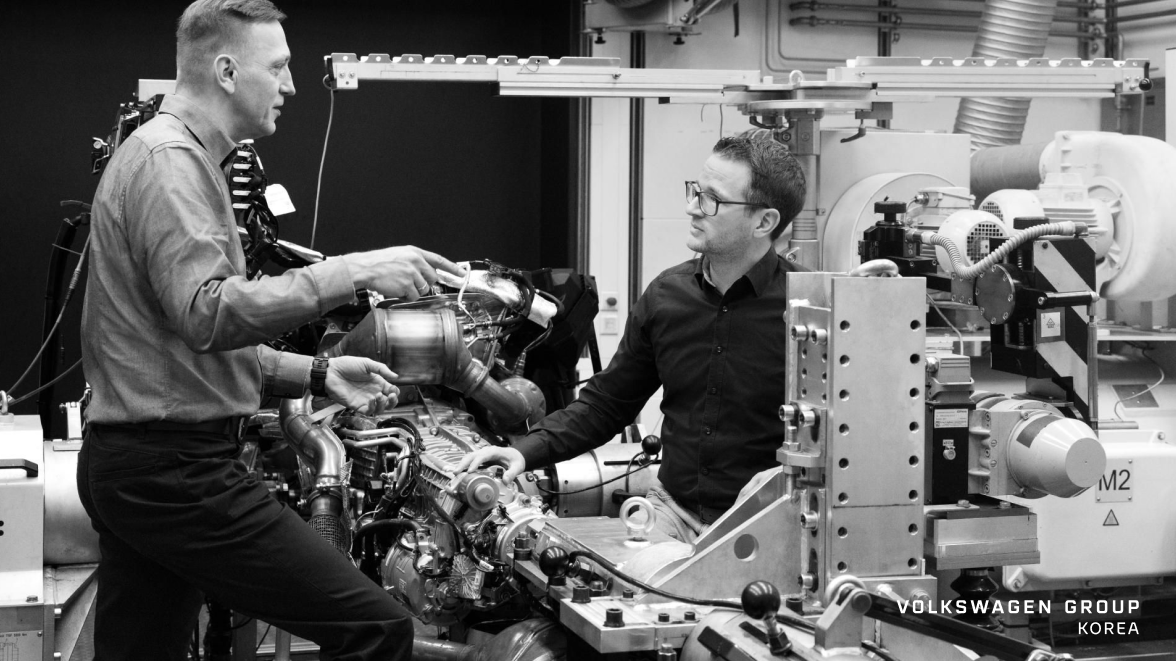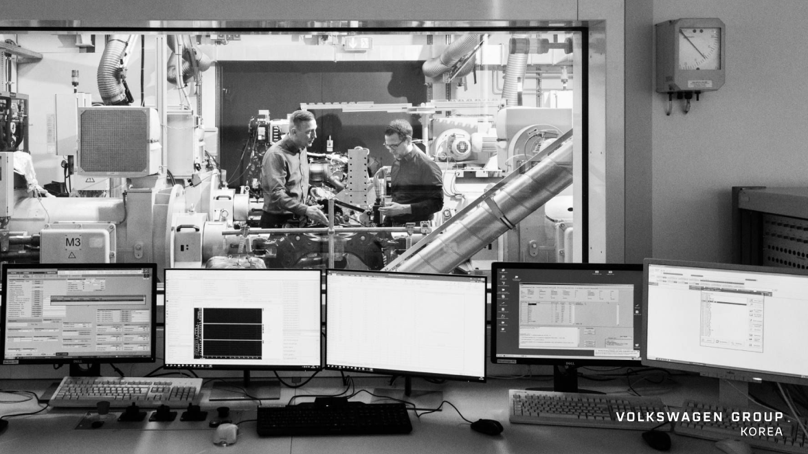 테스트 벤치와 제어실을 분리하는 어두운 큰 유리창 너머로는 케이블, 호스 및 콘솔들이 복잡하게 얽혀있습니다. 그 중간에는 드라이브 트레인이 설치되어 있습니다. "여기가 바로 아우디 AG의 엔진 개발의 중심입니다."라고 디터 바이데만 (Dieter Weidemann)이 말합니다. "위층에서는 엔진과 변속기의 신규 개발 및 개선 작업이 진행되고 있습니다.” 지상층의 두터운 유리 뒤에 위치한 관련 변속기 센터의 시험대에서는 다양한 기준에 따라 전륜 및 사륜구동 모델에 대한 내구성 테스트와 실험이 진행됩니다. 하지만 여기서는 아무도 사륜구동이라고 말하지 않습니다. 바이데만이 말하길 "아우디에서 사륜구동을 떠올린다면, 그건 곧 콰트로(quattro)를 말하죠!"