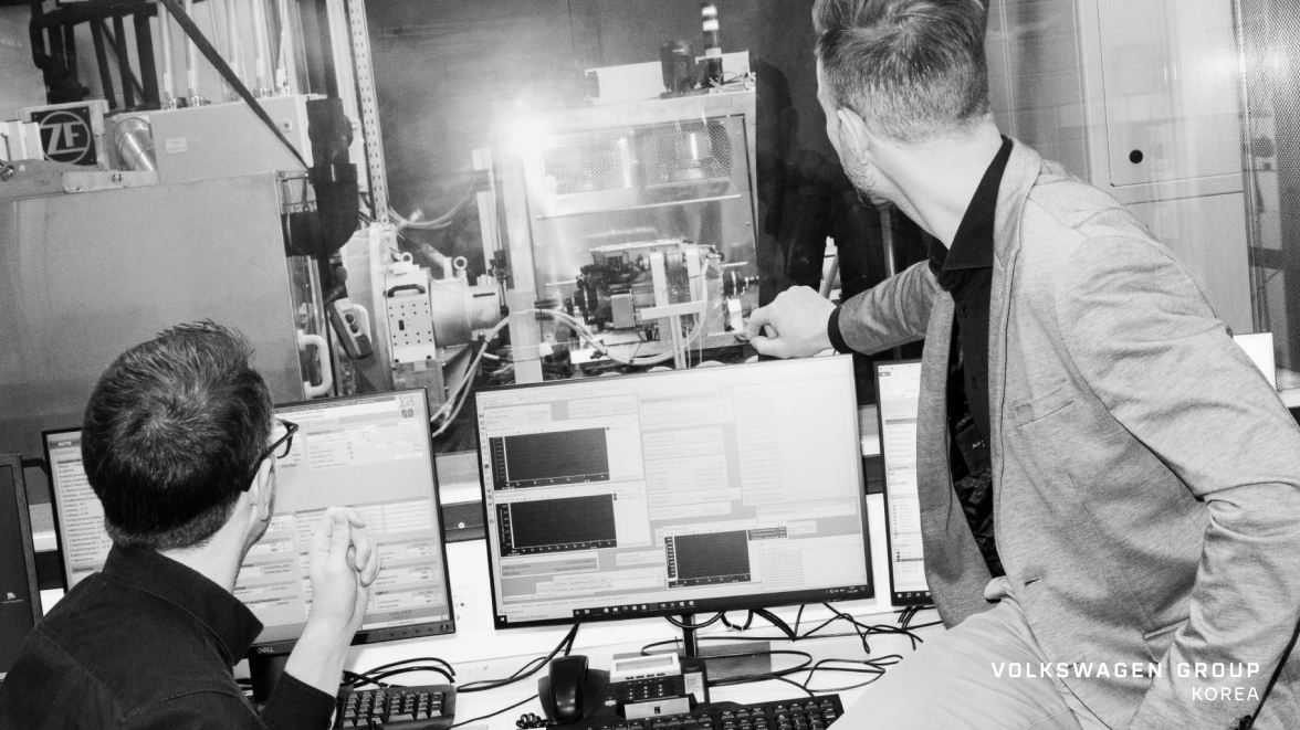 바스티안 하이들러와 코르비니안 베버는 컨트롤 모니터 앞에 앉아, 파워트레인 시험대에 설치된 전기 구동 장치를 바라보고 있습니다.