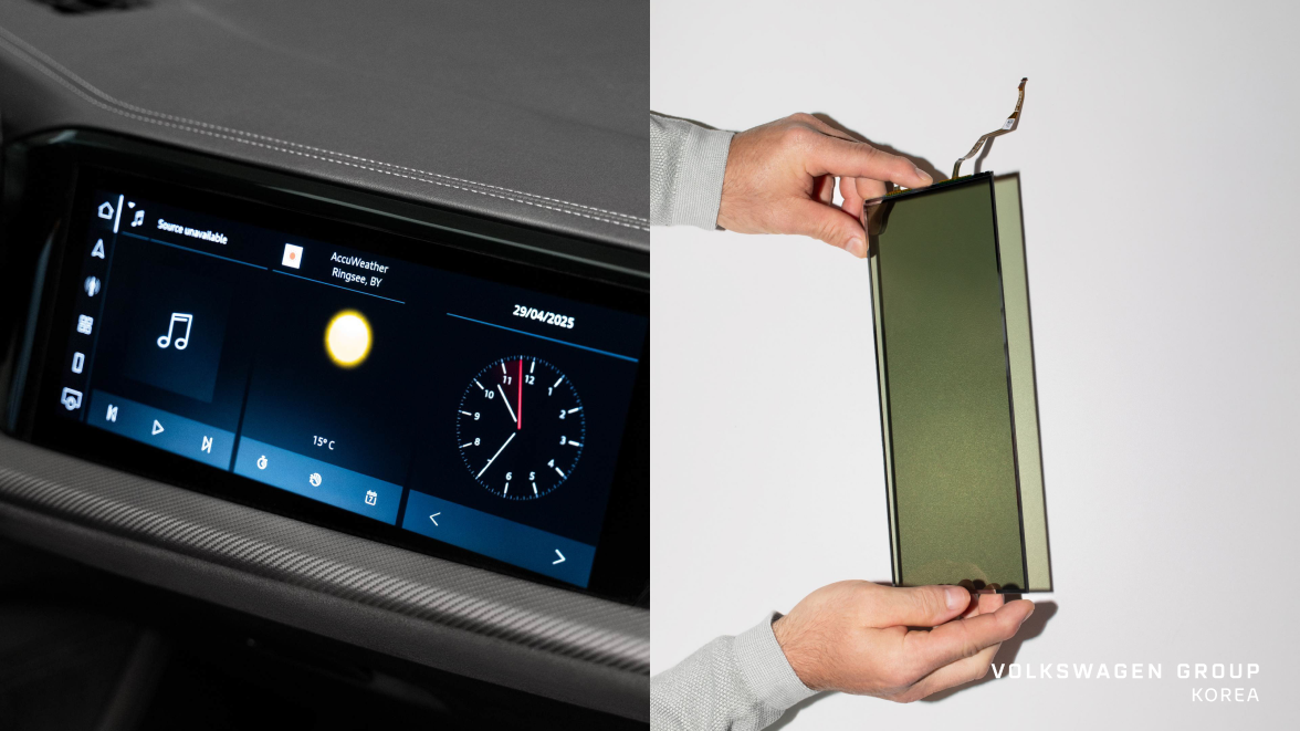 *조수석 디스플레이는 단순한 엔터테인먼트를 넘어, 운전자에게 추가적인 가치를 제공합니다. 곡선형 디스플레이와 함께, 조수석 디스플레이에는 음악, 날씨, 시간 등의 정보가 표시되어 운전 중에도 유용하게 활용할 수 있습니다. (좌)