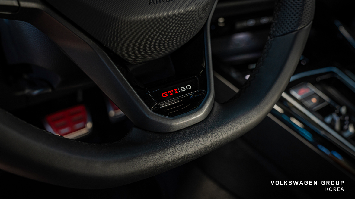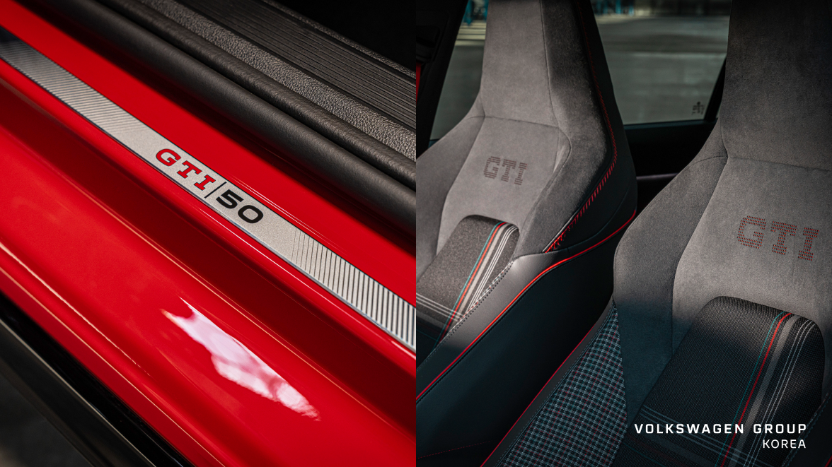 특히, 리어 루프 스포일러와 사이드 미러 안쪽에 숨겨진 ‘GTI 50’ 로고는 오직 에디션 50에서만 만날 수 있는 특별한 디테일입니다. 측면 하단에는 검은색에서 빨간색으로 이어지는 독특한 그라데이션이 적용돼 보는 각도에 따라 역동적인 인상을 줍니다.